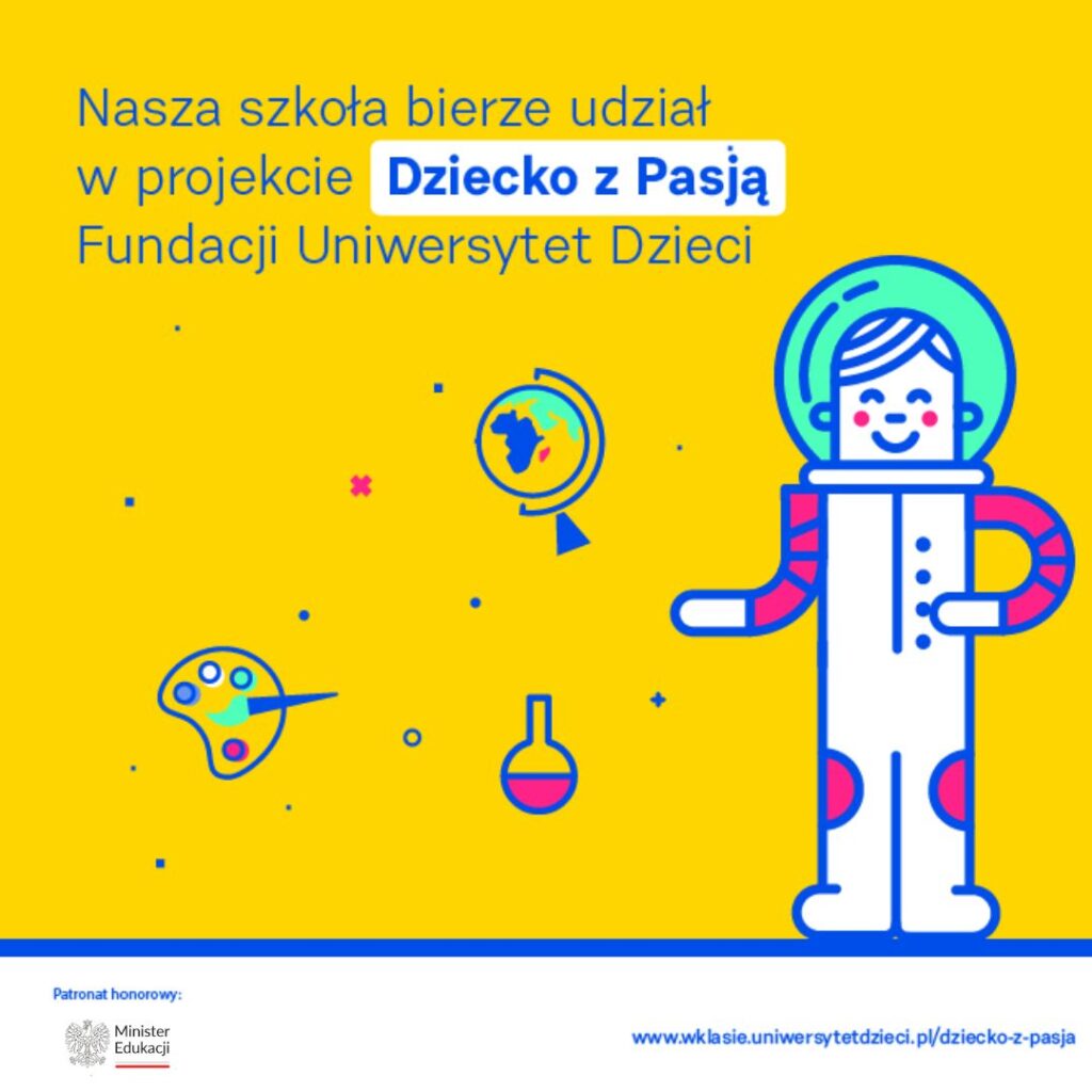 Nasza Szkoła w Cygance zakwalifikowała się do ogólnopolskiego projektu DZIECKO Z PASJĄ – 4. edycja, objętego Honorowym Patronatem Ministra Edukacji. Będzie on realizowany w roku szkolnym 2025/26. Podmiotem prowadzącym oraz organizującym jest FUNDACJA UNIWERSYTET DZIECI, a jego uczestnikami są dyrektor naszej placówki, jego zastępca oraz nauczyciele i wychowawcy. Projekt realizować będziemy w celu: rozwijania twórczego i intelektualnego potencjału dzieci, wzmocnienia kluczowych kompetencji społecznych, nauki współpracy i współdziałania, kształtowania umiejętności krytycznego myślenia, rozbudzania u najmłodszych pasji do zdobywania wiedzy. Kluczowym założeniem dla całej społeczności szkolnej jest budowanie atmosfery, w której dzieci odkrywają, że nauka może być pasjonująca.