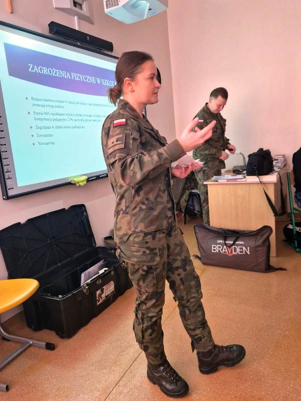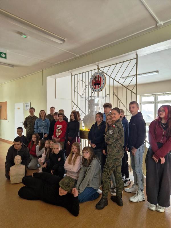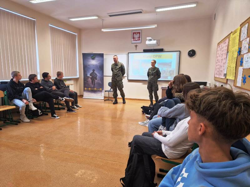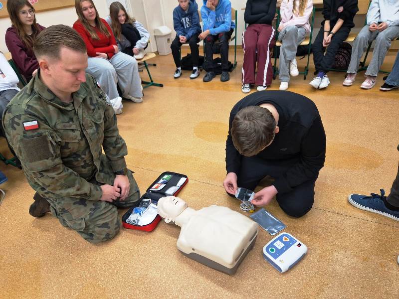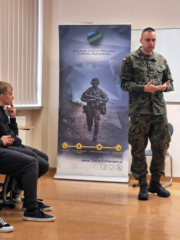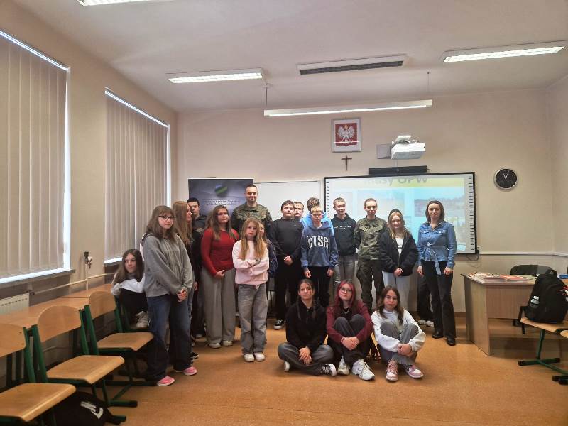 24 listopada 2025 r. gościliśmy w naszej szkole Żołnierzy z 23.Bazy Lotnictwa Taktycznego im. ppłk. pil. Jana Zumbacha w Mińsku Mazowieckim, którzy przeprowadzili w klasach VI, VII i VIII zajęcia proobronne w ramach IV edycji programu ogólnopolskiego EDUKACJA Z WOJSKIEM. Ich celem było podniesienie świadomości młodzieży w obszarze bezpieczeństwa i obronności oraz kształtowanie podstawowych umiejętności w zakresie udzielania pierwszej pomocy. Szkolenie łączyło teorię z praktyką. Uczniowie zapoznali się z zasadami alarmowania, podstawami ewakuacji i schronienia, sposobami szukania i wzywania pomocy oraz reagowania w sytuacji kontaktu z niezidentyfikowanymi obiektami. Mieli możliwość przećwiczyć na fantomie resuscytację oraz defibrylację. Wojskowi Szkoleniowcy przekazywali wiedzę w sposób ciekawy, praktyczny i dostosowany do wieku odbiorców.