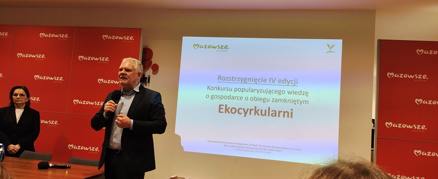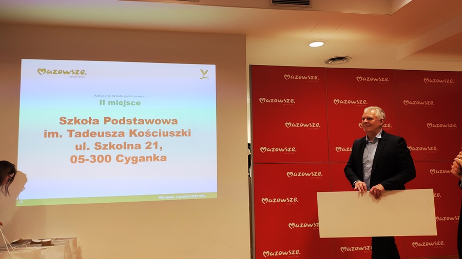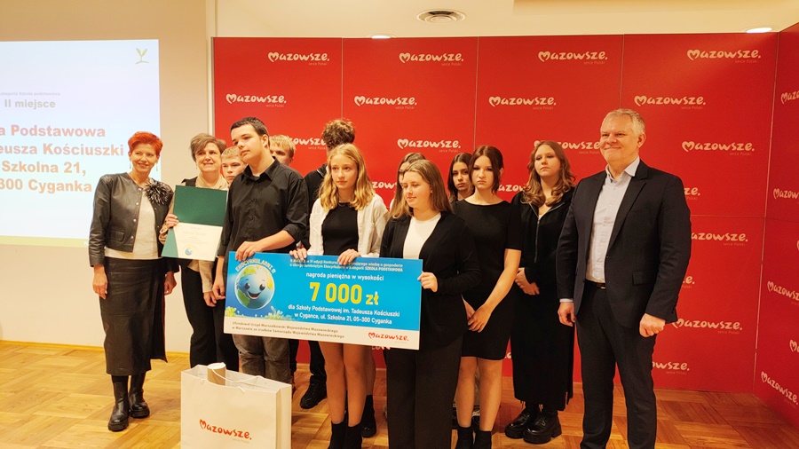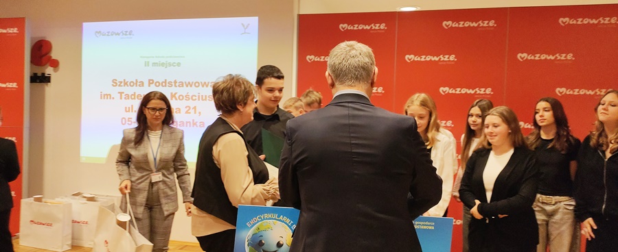 4 grudnia 2025 r. uczniowie klasy VII wraz z Koordynatorem Projektu i Wychowawcą p.Agnieszką Pawlak oraz Dyrektorem Szkoły Małgorzatą Wachowicz, wzięli udział w Gali Finałowej konkursu EKOCYRKULARNI. Wręczenie nagród Laureatom miało miejsce w Urzędzie Marszałkowskim Województwa Mazowieckiego, przez Dyrektora Departamentu Gospodarki Odpadami, Emisji i Pozwoleń Zintegrowanych p.Marcina Podgórskiego. Konkurs miał na celu promowanie gospodarki cyrkularnej (obiegu zamkniętego) oraz ukazanie i docenienie pomysłowych i oryginalnych pozalekcyjnych aktywności szkół i nauczycieli z województwa mazowieckiego.