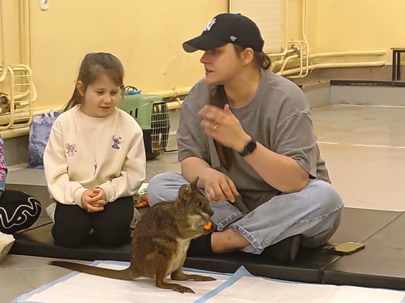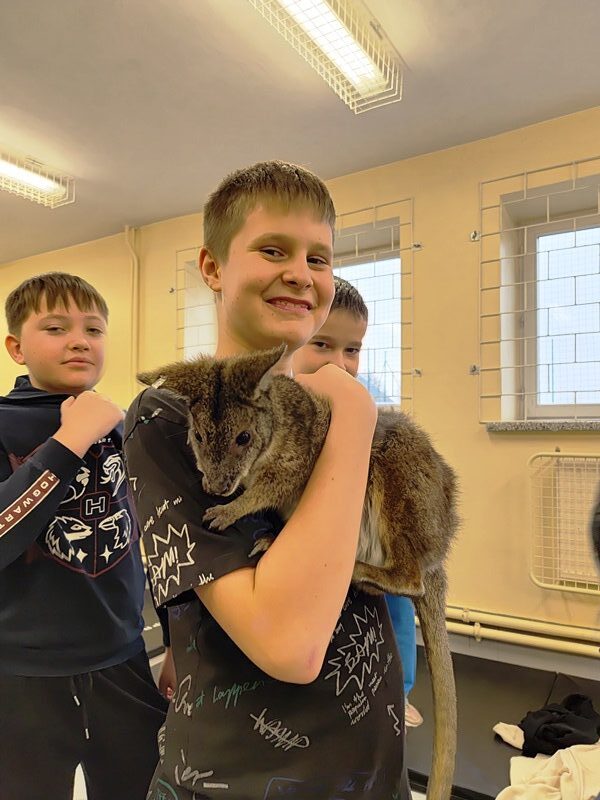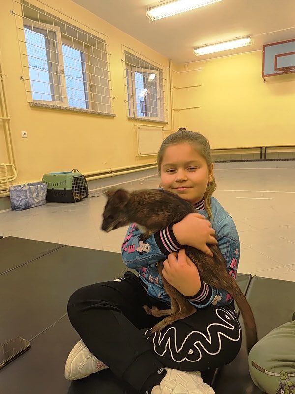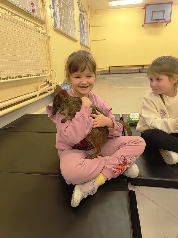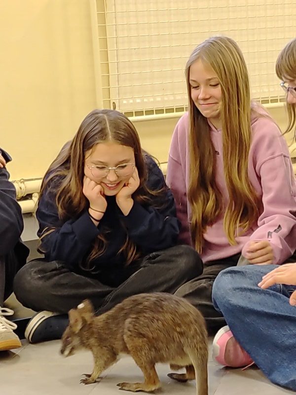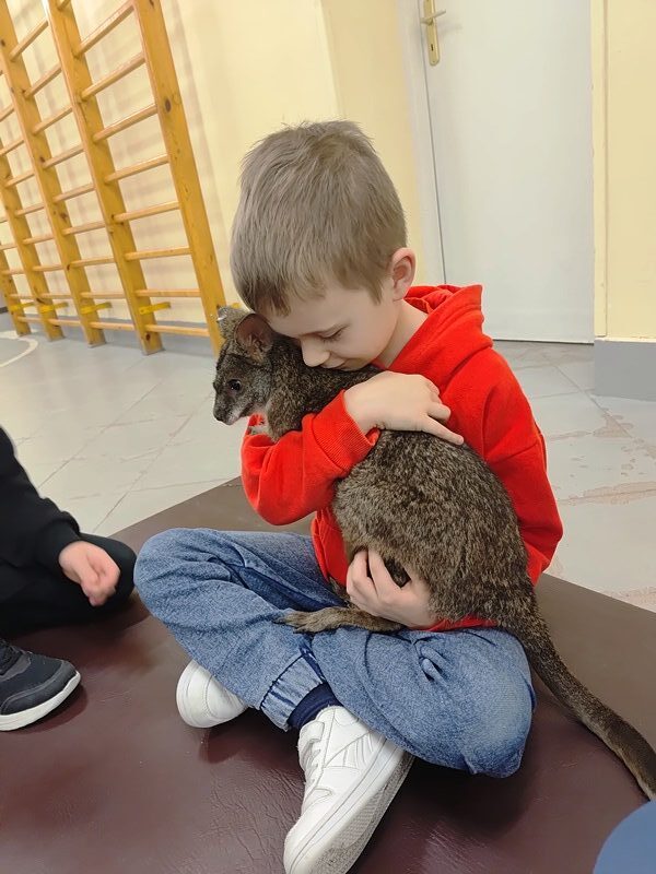 9 grudnia 2025 r. do naszej szkoły zawitała Opiekunka odlotowych zwierząt, która przyprowadziła ze sobą uroczego mini kangura. Pademelon czyli “mały z lasu” w języku Aborygenów, swobodnie poruszał się po sali, co pozwoliło uczniom na bliski kontakt i obserwację jego zachowań. Uczniowie wysłuchali ciekawych informacji o o zwierzęciu, które znajduje się w herbie Australii i oznacza postęp. Mieli okazję karmić to niezwykłe zwierzę, co wywołało wiele radości i emocji. Kangurek lubił kontakt z ludźmi, zatem każdy uczestnik mógł przytulić się do niego, co było dużym przeżyciem.